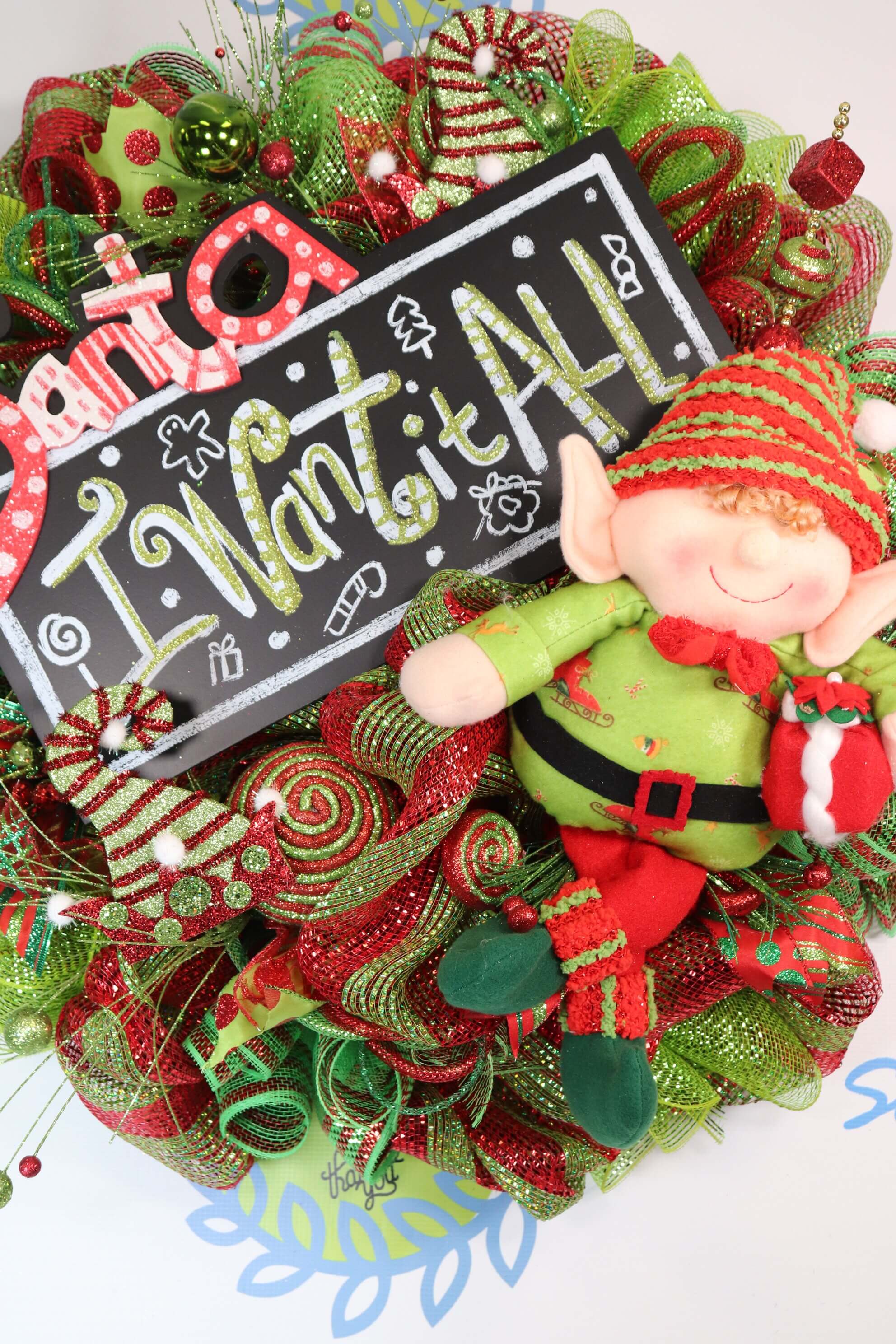Santa I Want it All, says this adorable Elf. Christmas is coming!! Greet your holiday guests with this full and festive red and green deco mesh wreath. This wreath just sparkles with all things Christmas. It starts on a base of red and lime green striped deco mesh. I have added lots of holiday sparkle picks and sprays throughout. This wreath features an adorable plush elf as well as a wooden sign letting Santa know that you want it all! Ornaments, wired ribbon and deco mesh tubing complete the look for this holiday wreath! This wreath is approximately 29 inches in diameter and is made on a 16 inch wire work wreath. It is very full and fabulous!! Get yours before it’s gone!