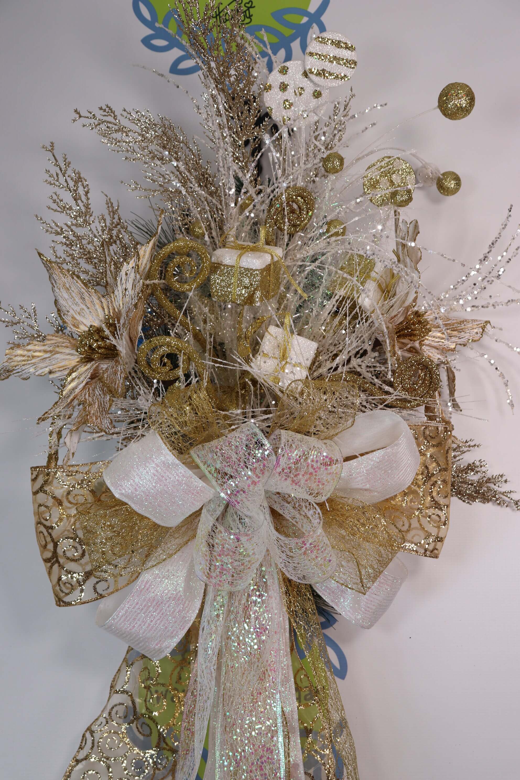 This tree topper celebrates the traditional side of Christmas with colors in gold and white. This bow features 4 wired ribbons in a full and beautiful bow. The tree topper has two large poinsettias in white with gold features. It features glittered branches in gold and white, white swirl picks, glittered picks, and ornaments and presents in gold and white. This tree topper should be attached to the trunk of your tree using chenille stems (included) or zip ties (not included).