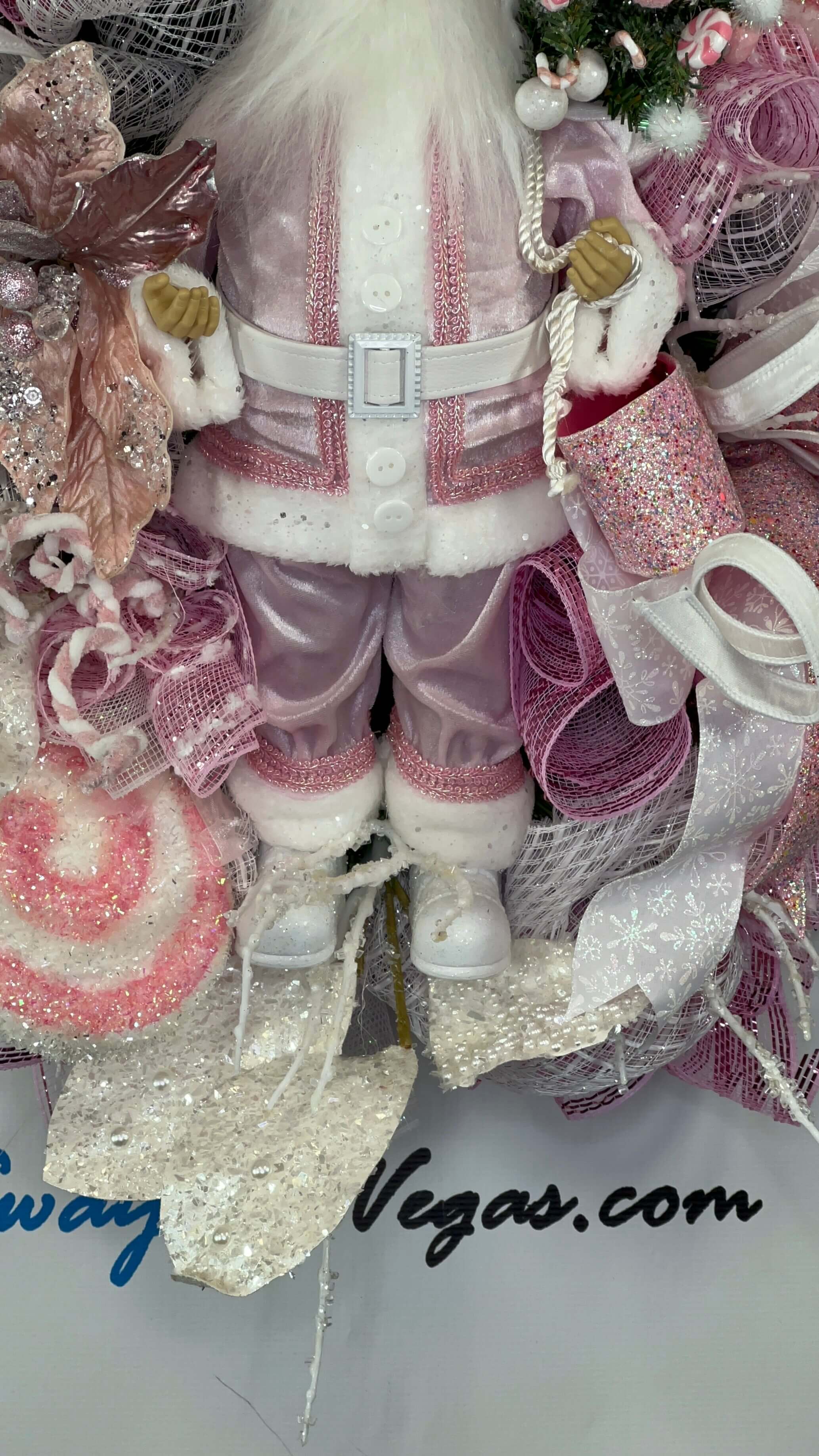 Celebrate the holiday season with this charming Vintage Pink Santa Christmas door swag, a perfect blend of elegance and festivity. This handmade decoration features a beautifully detailed Santa Claus in a soft pink suit, surrounded by shimmering ribbons, glittering ornaments, and frosted accents that capture the essence of a winter wonderland.