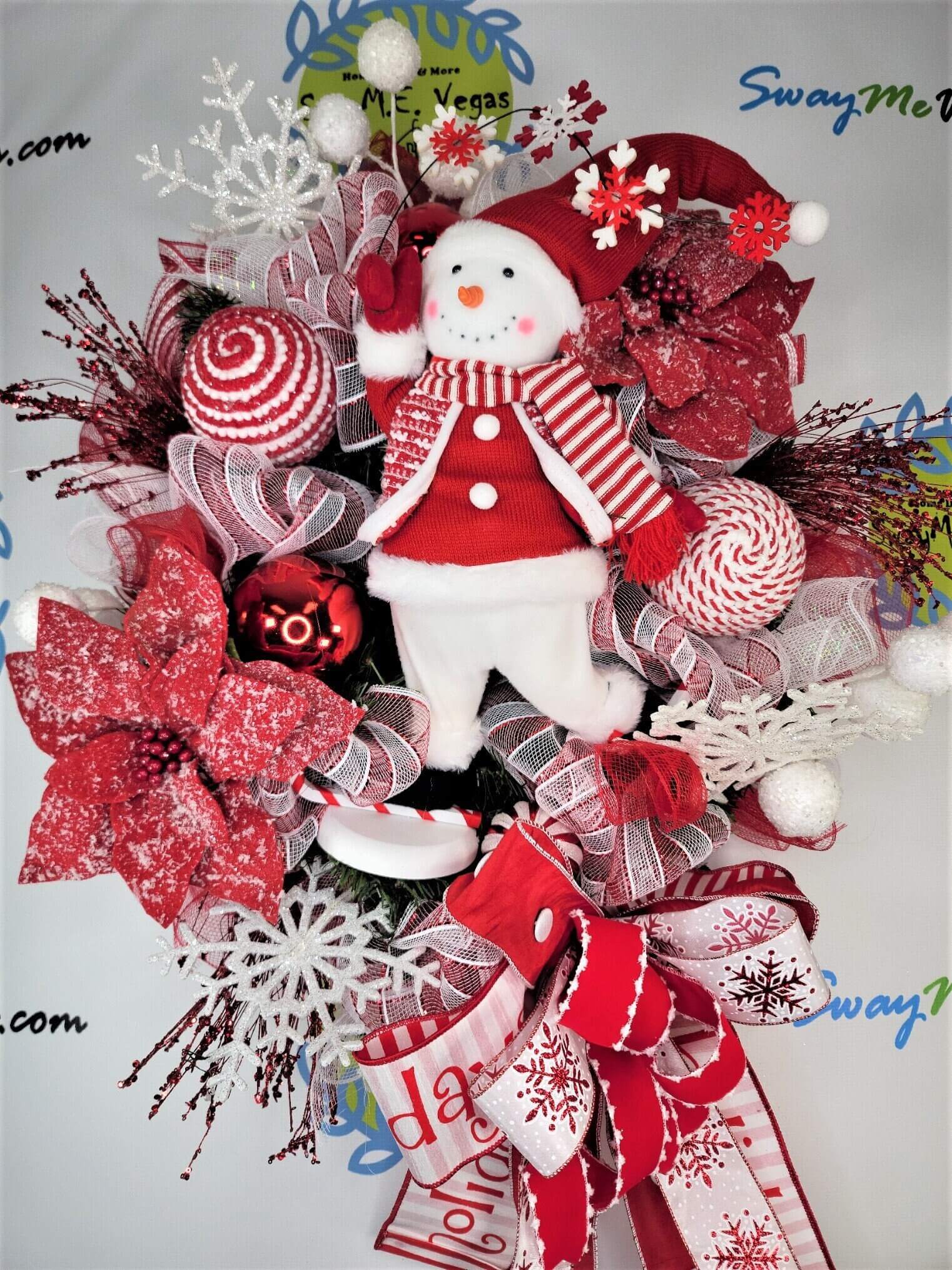 Ho Ho Ho!! Celebrate the Christmas Season with this full and fabulous Snowman wreath. This wreath features all kinds of goodies. Made on a pine , this wreath begins with red white and green snow metallic deco mesh. I have added curls of deco mesh throughout the wreath to aid in it’s fullness. This wreath also features a large handmade bow made with 4 different wired ribbons. Some of the goodies on this wreath include ornaments, glittered sprays in white, red and green, large glittered snowflakes, and so much more. The feature of this wreath is the adorable snowman in the center.