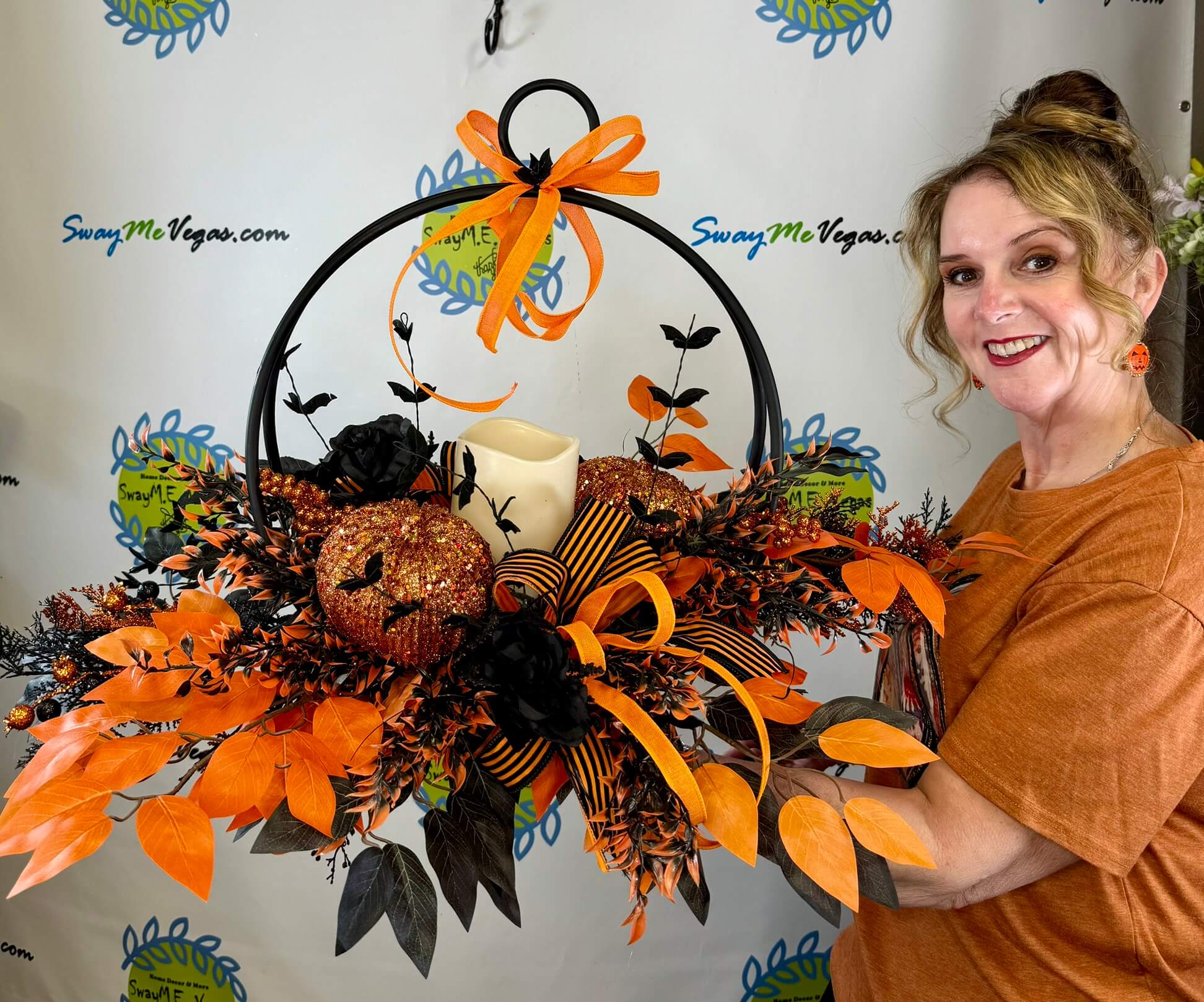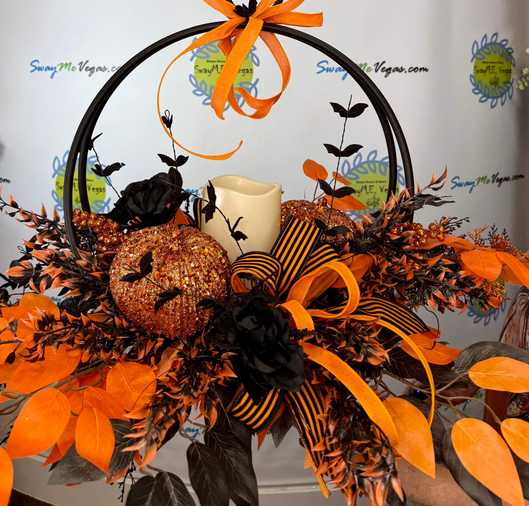 Set the scene for your spooky soirée with this striking Halloween centerpiece featuring a glittering jack-o’-lantern, bold orange and black foliage, and a LED battery-operated candle in a chic hoop frame. This handmade arrangement is perfect for your dining table, kitchen island, or entryway — a showstopper that mixes elegant Halloween style with seasonal charm.