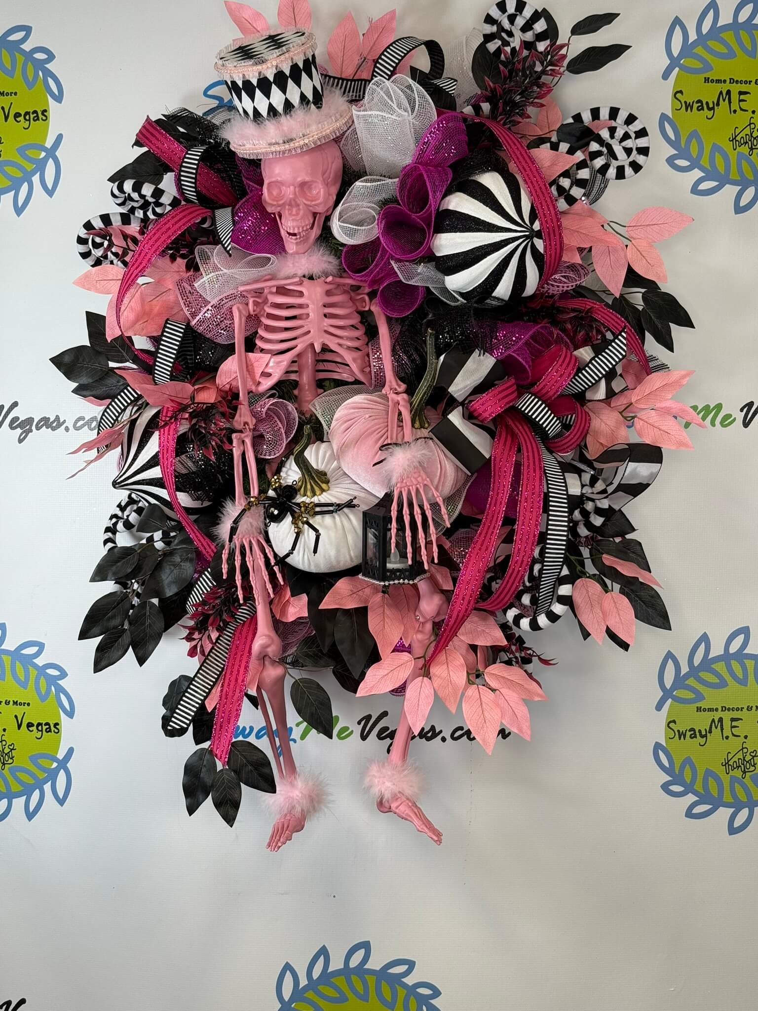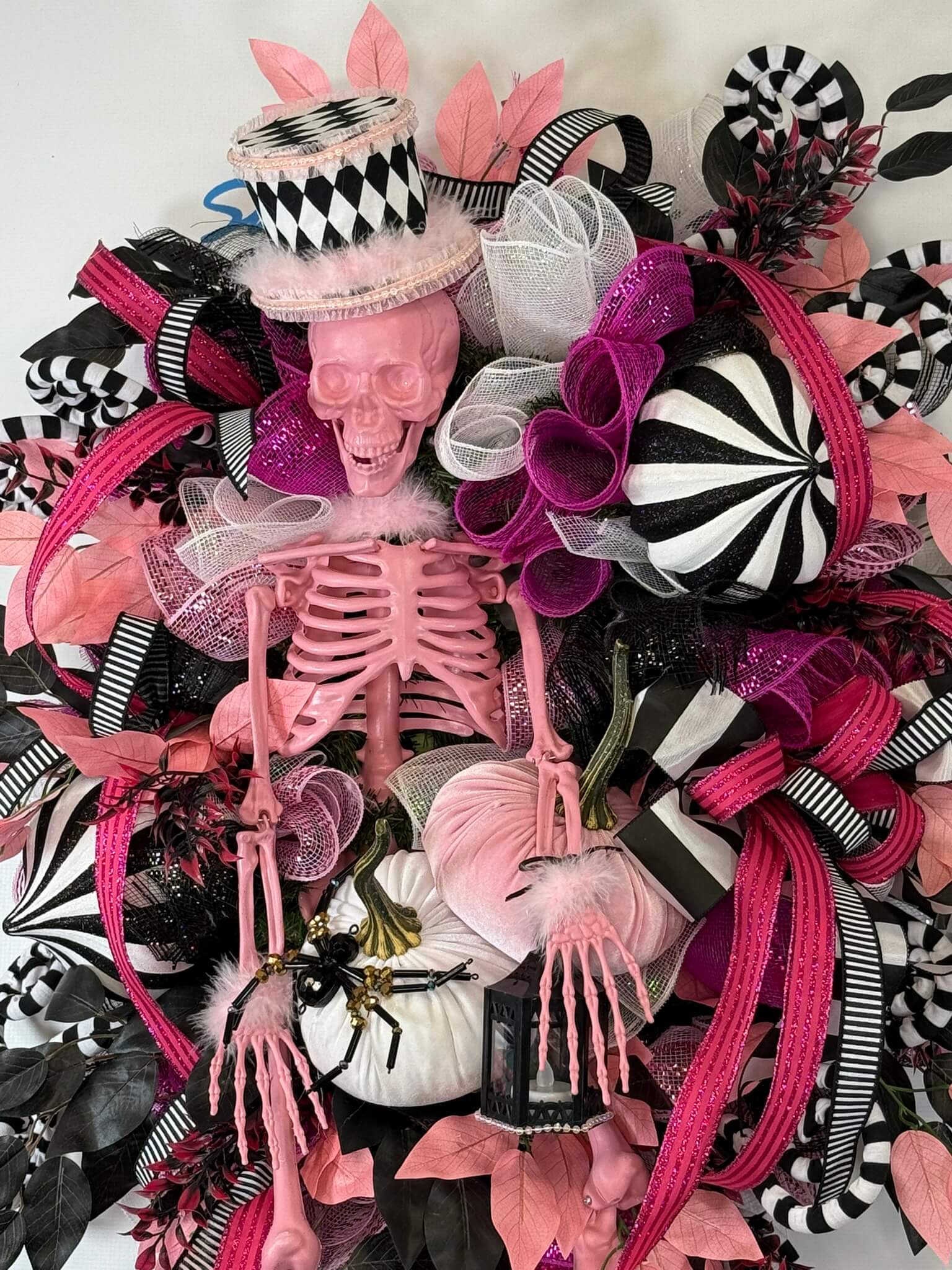 This pink skeleton Halloween wreath is a bold, spooky, and fabulously glam twist on traditional Halloween décor. With a bubblegum pink skeleton centerpiece wearing a harlequin top hat, surrounded by lush ribbons in black, white, and glittery hot pink, this one-of-a-kind wreath screams spooky chic!