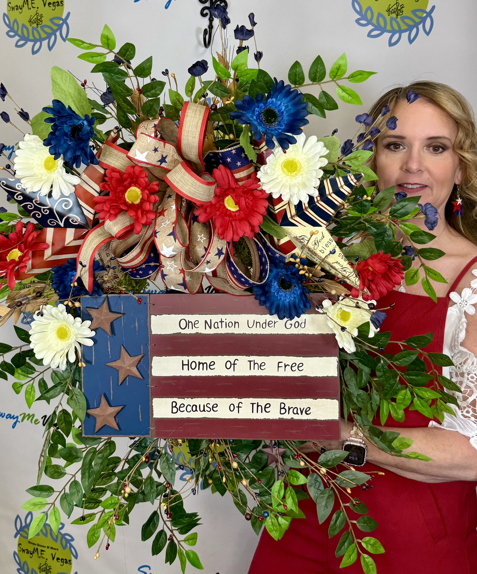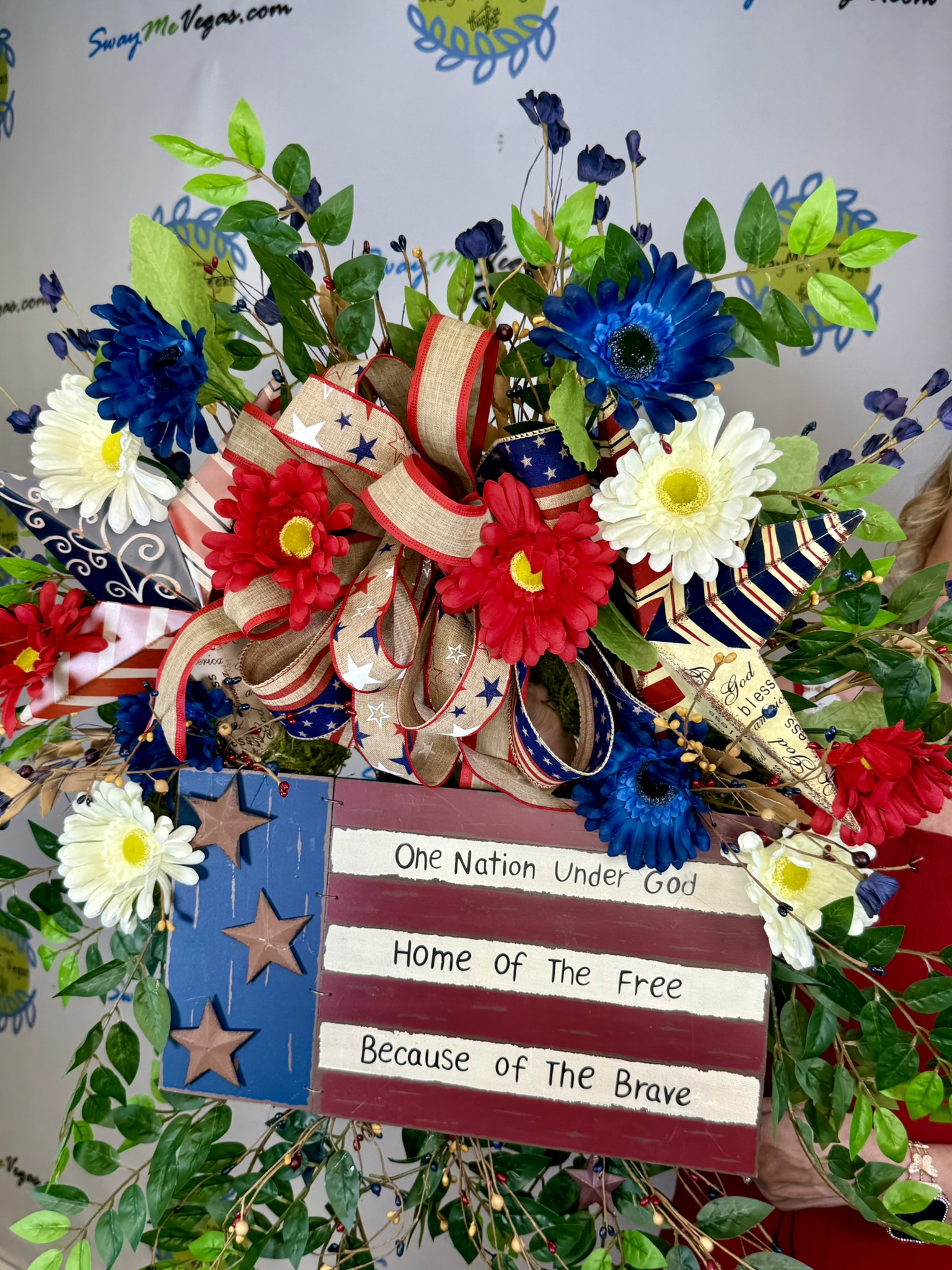 This lush, oversized patriotic wreath blends classic Americana charm with a fresh, garden-inspired feel. Designed on a natural moss base, it features vibrant red, white, and blue florals, layered greenery, and a beautifully detailed ribbon bow that pulls everything together.