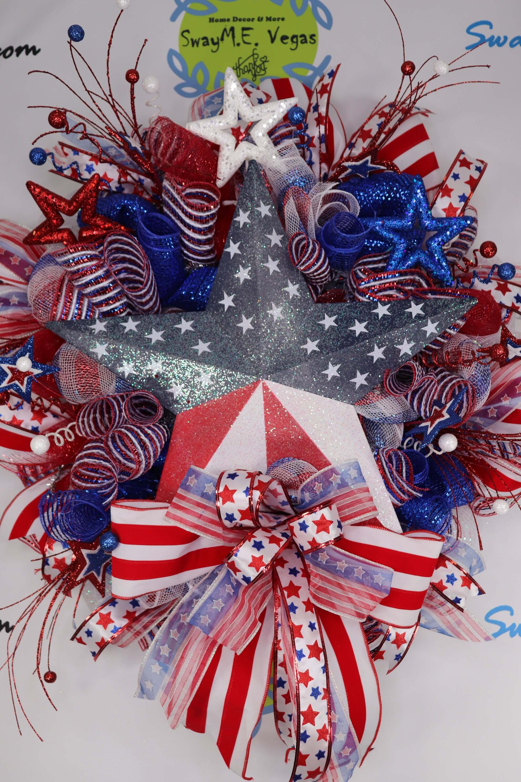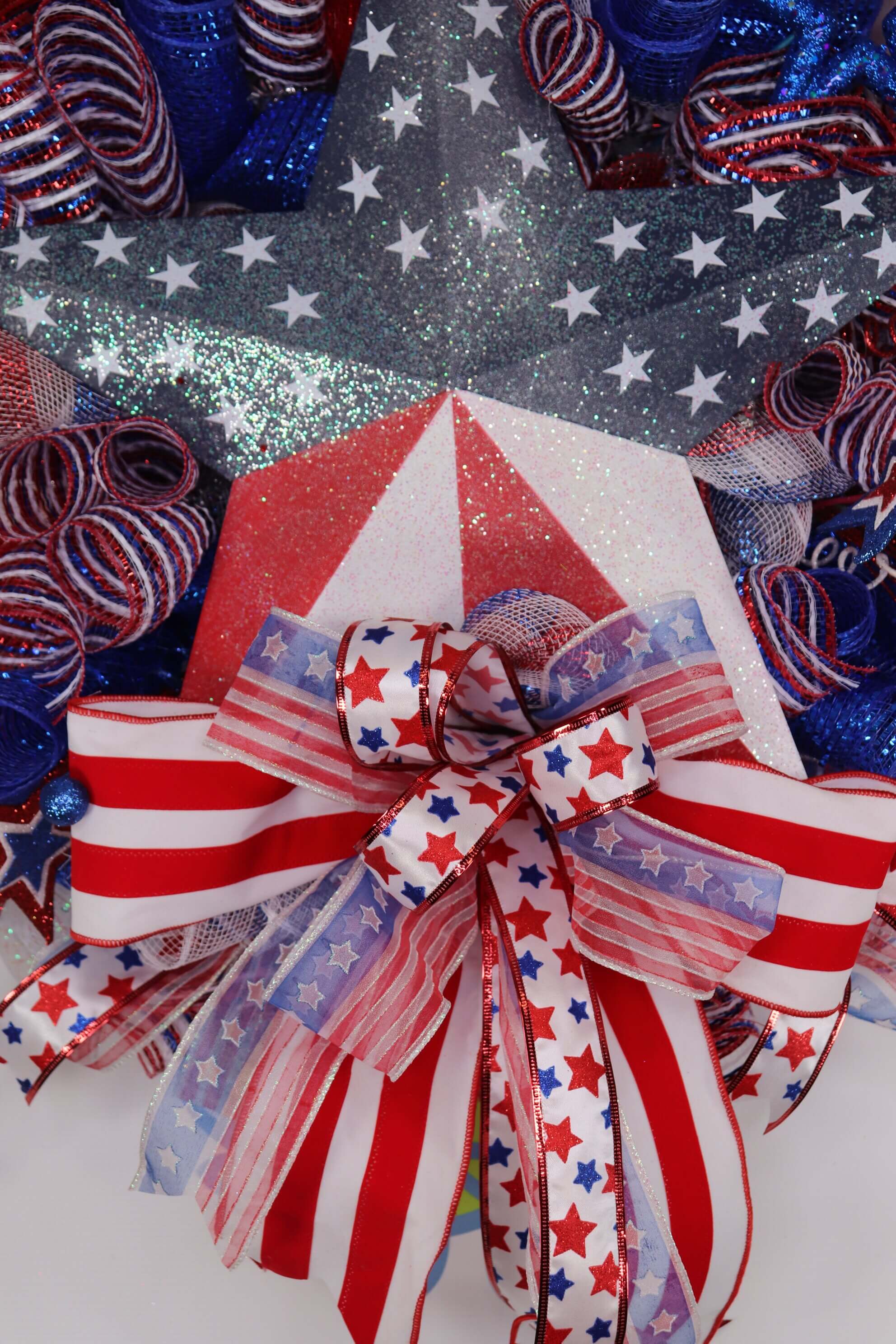 This wreath is filled with red, white and blue deco mesh. It is made on a wire wreath form and is filled with lots of star sprays in patriotic colors. It includes a large handmade bow featuring several patriotic ribbons with stars and stripes. This wreath features a large glittered red white and blue medal star in the middle This wreath measures 34 inches in length, 31 inches in width, and 11 inches in depth. This wreath would be amazing to showcase your patriotic pride!