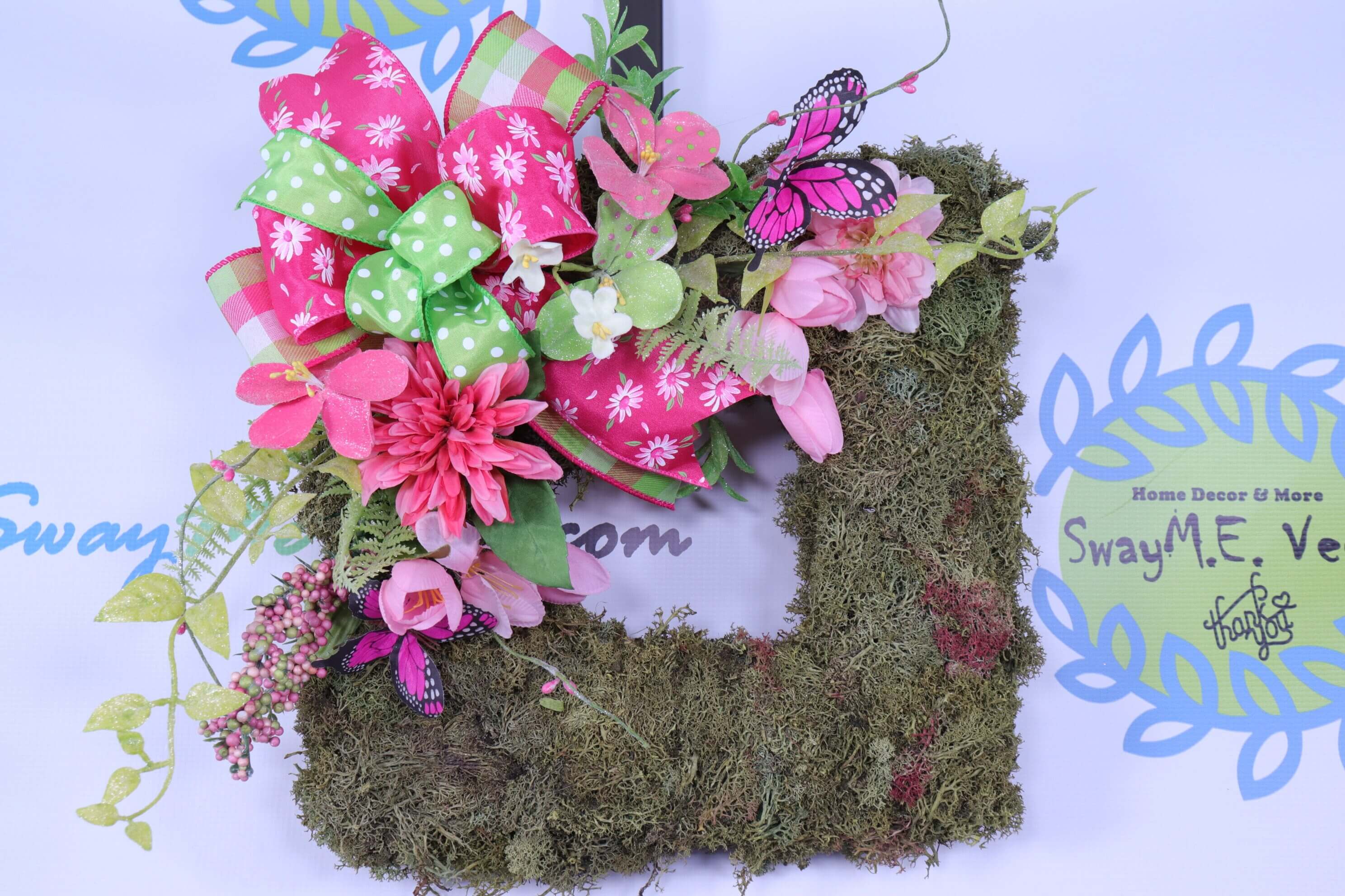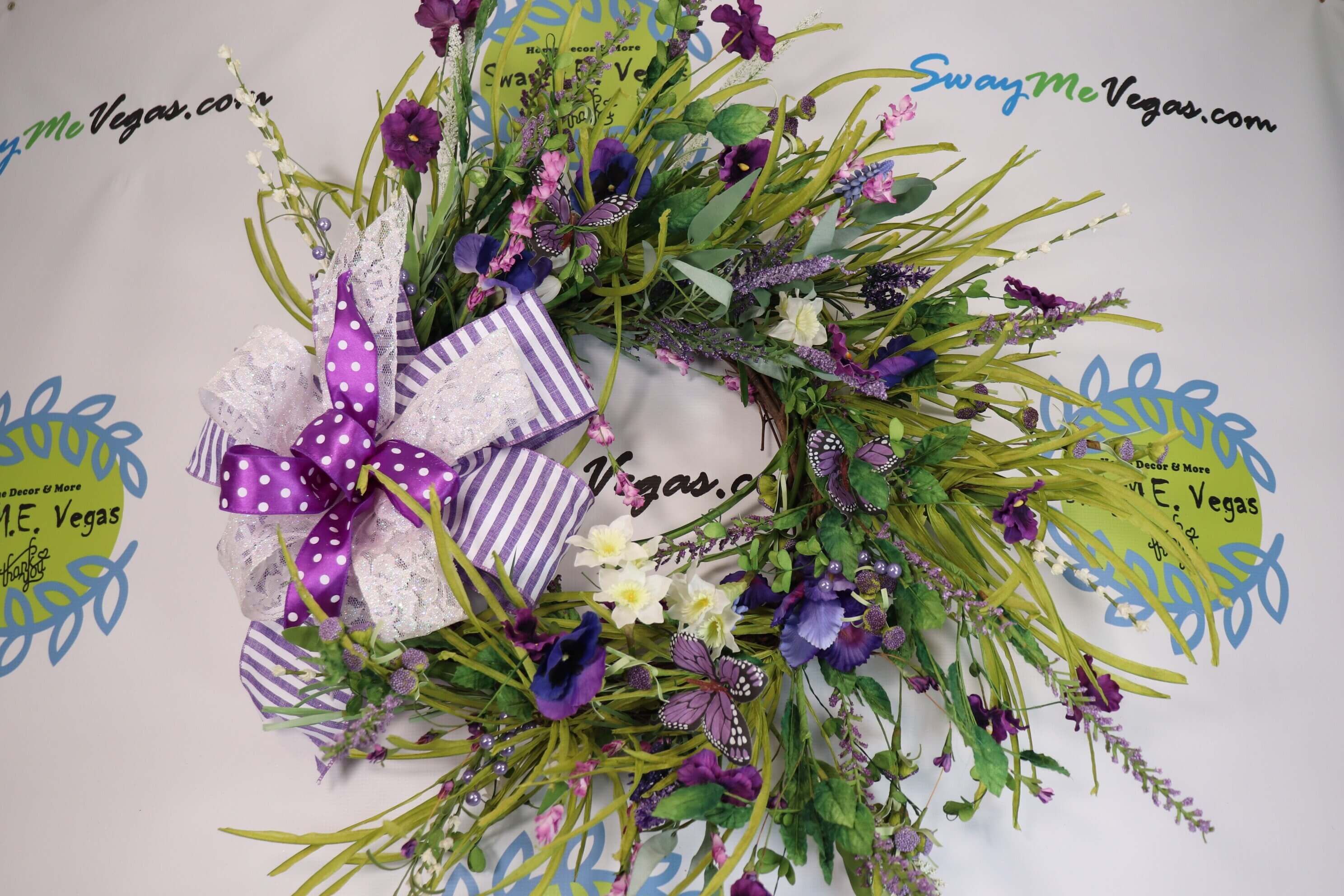 Purple Passion 💜💜This beauty is one of a kind! This stunning wreath is perfect for valentines, spring, Easter, Mothers Day, summer, and even year round. 💜💜🌼🌼 Made on an 16″ grapevine wreath base it features lots of an abundance of floral and greenery throughout the wreath. It also has delicate butterflies. It measures 26 inches in diameter and 10 inches in depth. . It also features a handmade wired ribbon bow in coordinating colors,