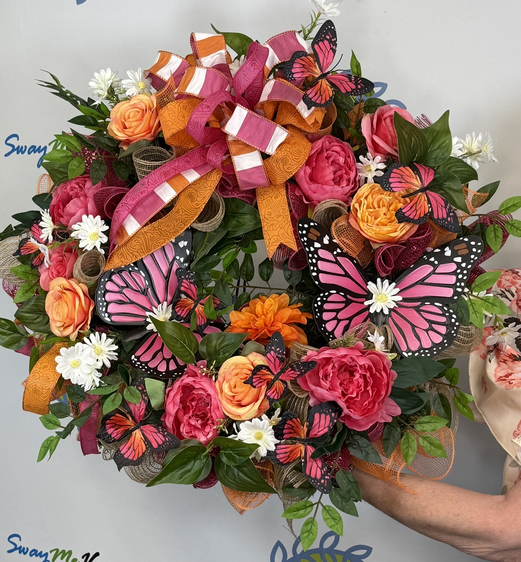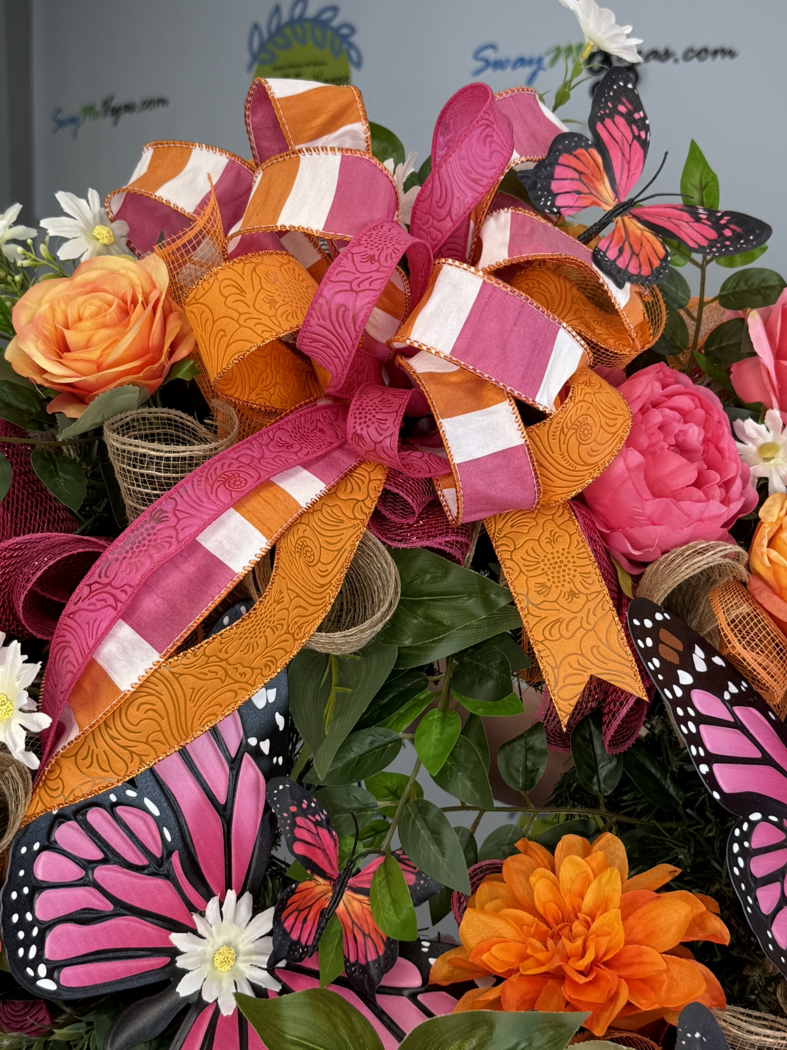 This vibrant spring-summer wreath is filled with bold pink and orange florals, lush greenery, and eye-catching butterfly accents that bring the entire design to life. The combination of soft garden florals and playful butterflies creates a look that feels both elegant and full of personality.