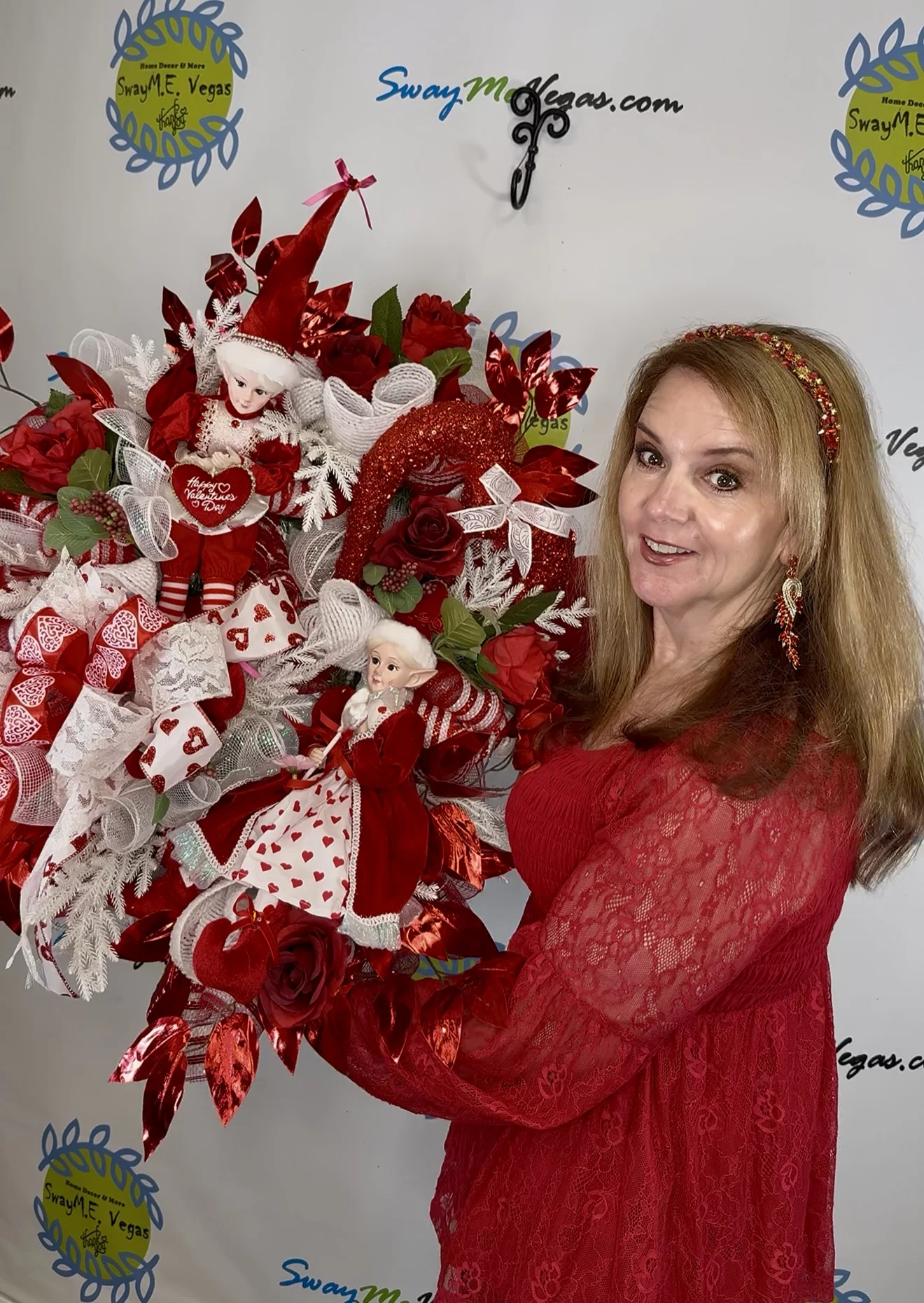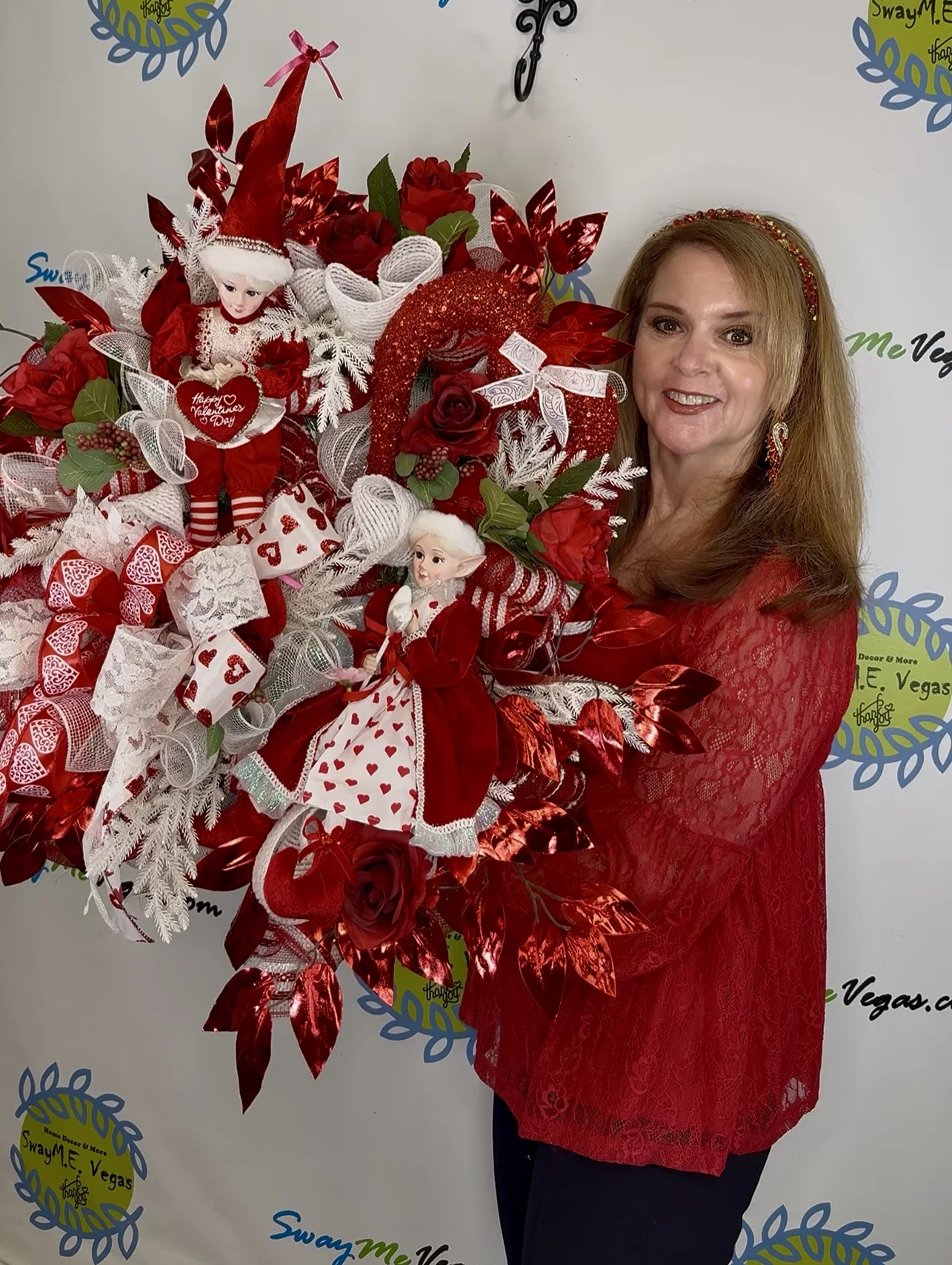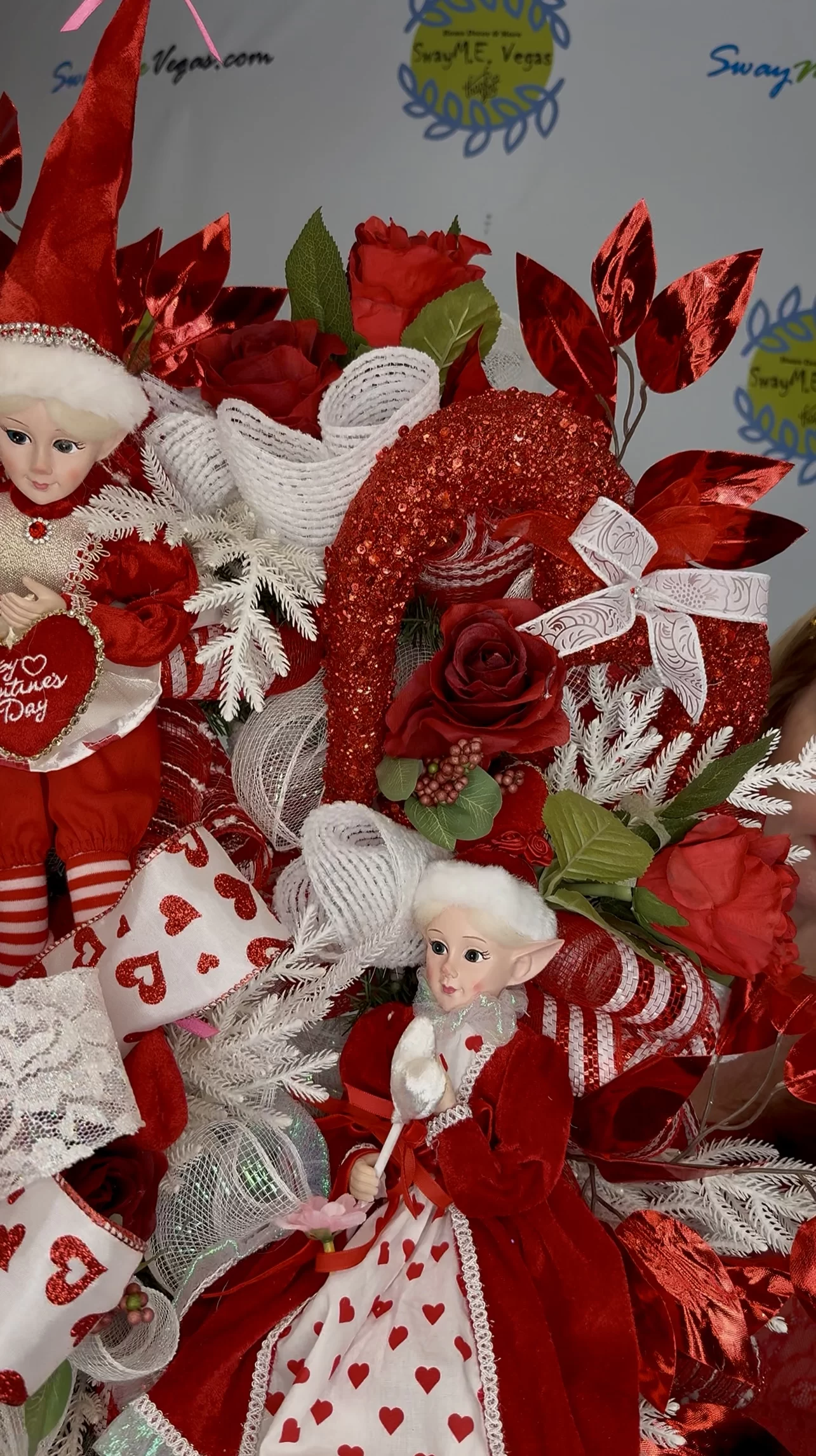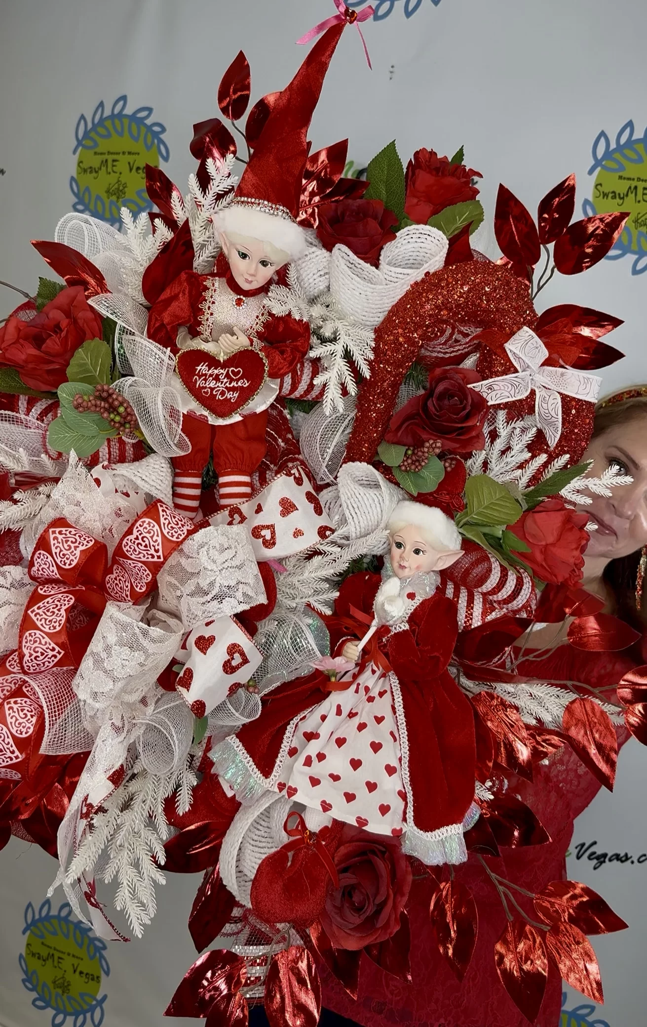 This piece showcases incredible detail—from the hand-posed elf dolls to the luxurious white ferns, glittered red hearts, and heart-printed bows. The coordinating elves wear red Valentine outfits with white lace and mini hearts, holding themed accessories that say “Happy Valentine’s Day.” Set among premium faux florals and red metallic leaves, this wreath is full of texture, sparkle, and movement.