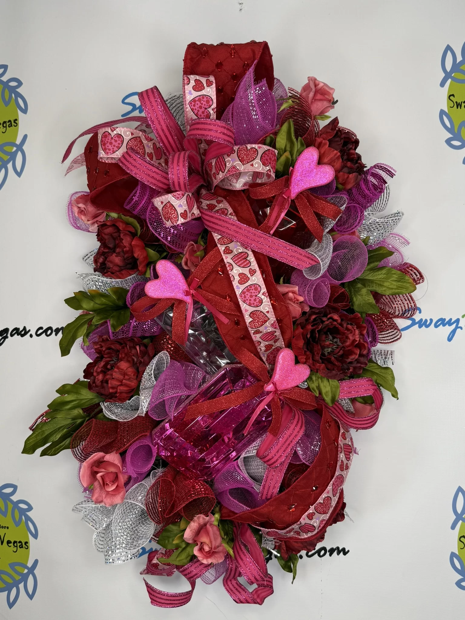 Crafted on a sturdy wired base, this piece includes vibrant red peonies, pink roses, glitter heart picks, and white mesh curls for added texture and elegance. Every detail has been thoughtfully arranged to create a high-impact, joyful look—ideal for Valentine’s Day, anniversaries, or adding romantic flair to your space.