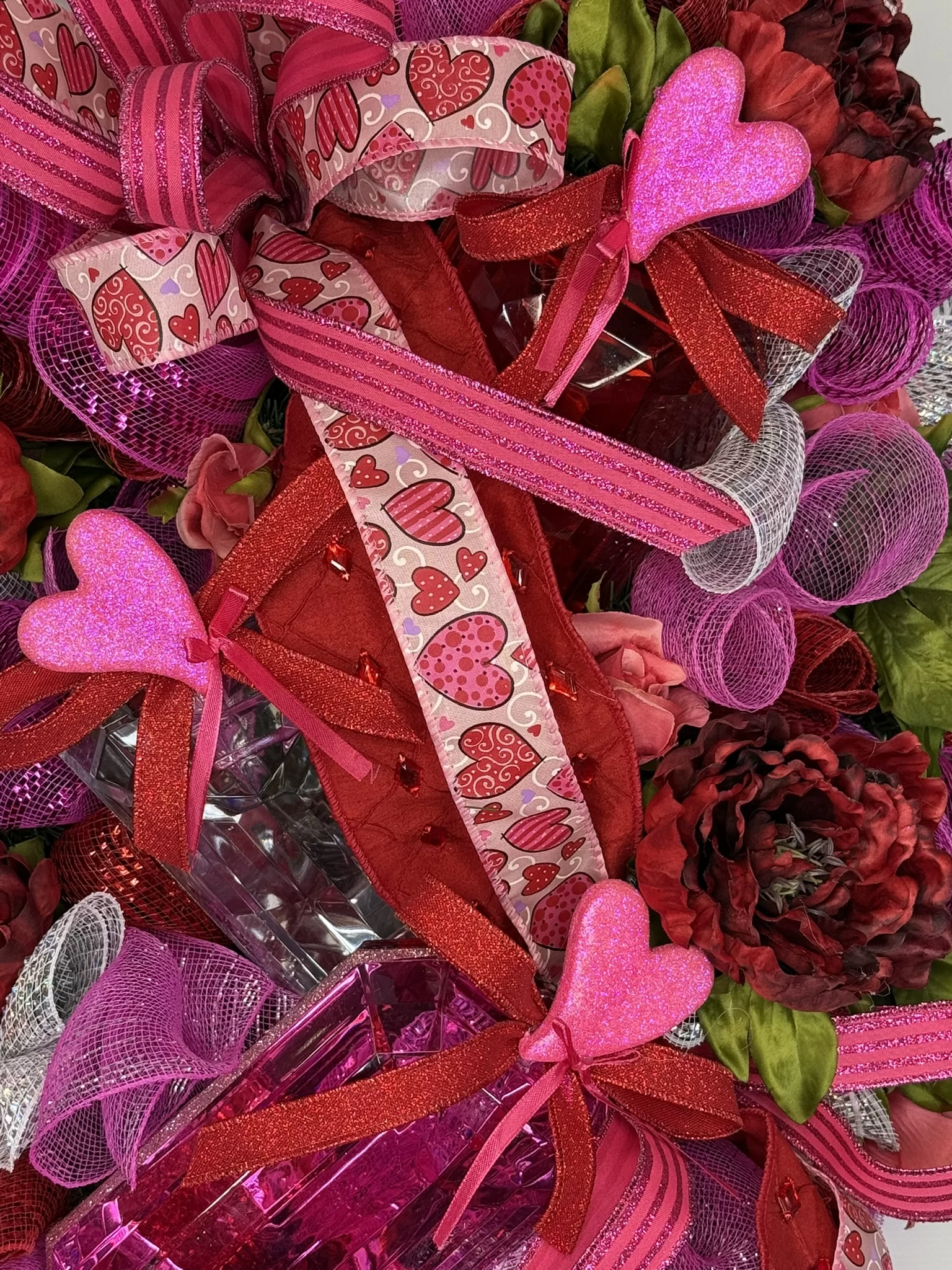 Celebrate love in full color with this stunning Valentine’s Day front door decor—a bold, romantic design bursting with charm and festive flair! This handmade design features a rich mix of red and pink deco mesh, heart-printed ribbons, shimmering glitter bows, and luxe florals. Nestled among the layers are three sparkling jewel accents, adding the perfect pop of shine and sophistication.